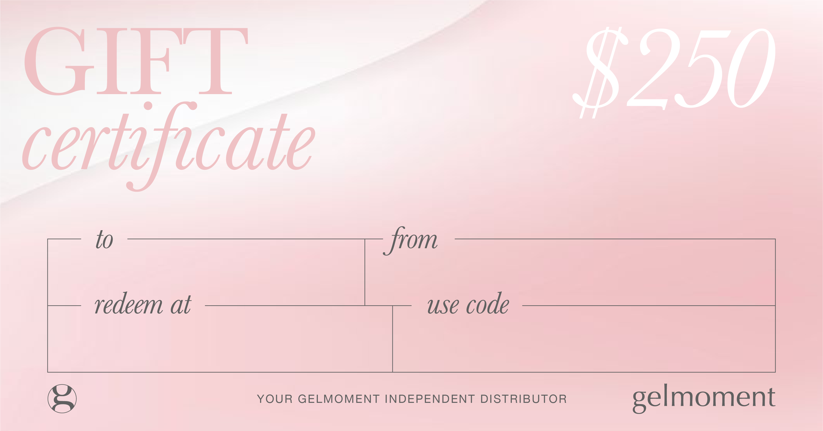 Gift Certificates cannot be purchased with credits, are not eligible for PRS, TSV, are not commissionable and are not included in Party Sales total. The redemption of the Gift Certificate code is fully commissionable, and is eligible for all requirements. Gift certificates are valid on all purchases, including the GelMoment Enrollment Package and Event Tickets.